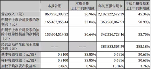 答:營業收入21.92億元,同比成長45.34%;淨利潤3.64億元,同比成長50.99%,前三季度淨賺3.64億